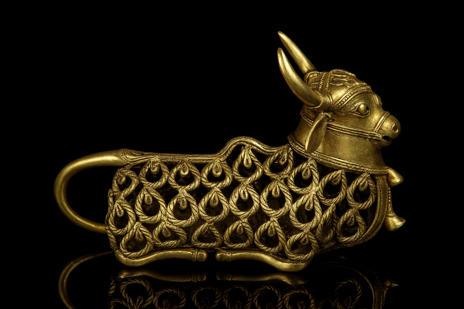 Dhokra art, practiced for over four millennia, is among the earliest known forms of metalcasting. Each sculpture begins with a detailed wax model, shaped meticulously using coils, ropes, and patterned strips — the very technique that gives this Nandhi its intricate openwork design. After the clay mould encases the wax, it is fired, allowing the wax to melt away and molten brass to take its place.